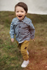 Wygodne spodnie chłopięce w modnym kolorze curry. Z przodu dwie kieszonki z przeszyciami, naszywka z napisem SECRET FOREST oraz ozdobne sznureczki w pasie. Spodnie mają w pasie szeroki, nieuciskający ściągacz, który utrzymuje ubranko w odpowiednim miejscu, podczas codziennych aktywności. W rozmiarach powyżej 74 ściągacz uzupełniony jest gumką. Luźny fason nie krępuje ruchów malca, co zapewnia mu komfort noszenia. Spodenki można dowolnie łączyć z innymi ubrankami z kolekcji Secret Forest.