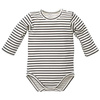 Mięciutkie body z długim rękawkiem, w czarno – kremowe, drobne paseczki. Uszyte z bawełny 100%. Rozpinane na ramionku i w kroczku na antyalergiczne, bezniklowe napki. Paseczki nadrukowane zostały bezpieczną metodą farby wodnej, która nie uczula wrażliwej skóry dziecka. Body doskonale przytrzymuje pieluchę i otula plecki dziecka, zapewniając maluszkowi ciepło i wygodę.