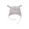 Śliczna, szara czapeczka w groszki. Czapka wiązana jest na dole pod szyją dziecka. Posiada wesołe wiązania przypominające uszka. Czapeczka dobrze przylega do główki dziecka i zasłania uszy przed wiatrem. Dobrze komponuje się z innymi ubrankami z kolekcji Unicorn.