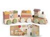 14 wysokiej jakości drewnianych klocków z różnymi wzorami i postaciami zachęca dziecko do odkrywania różnych opcji zabawy i kreatywnego układania.