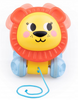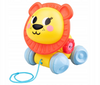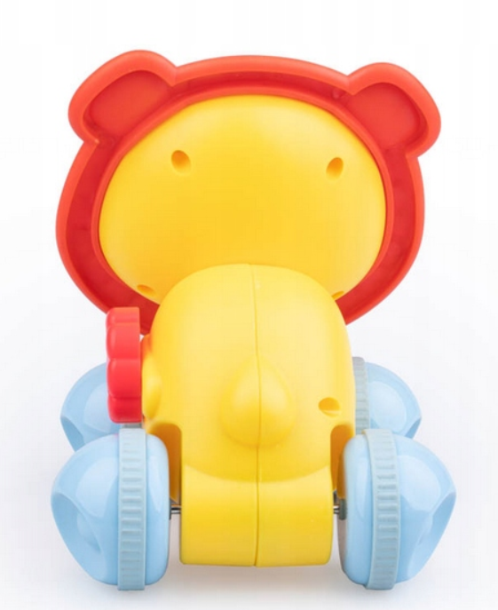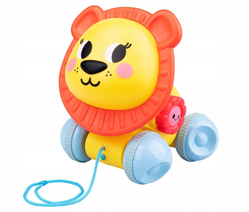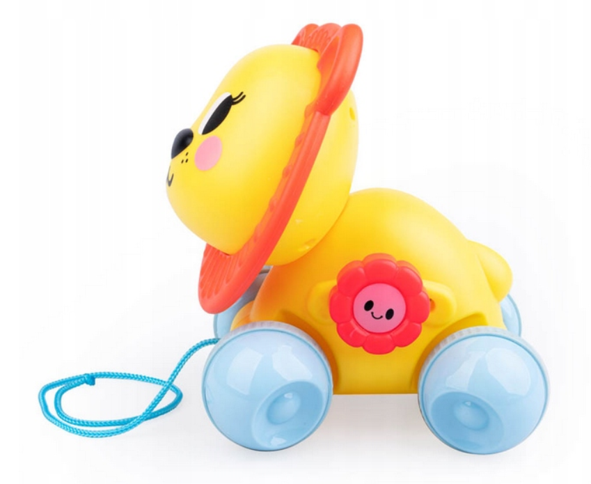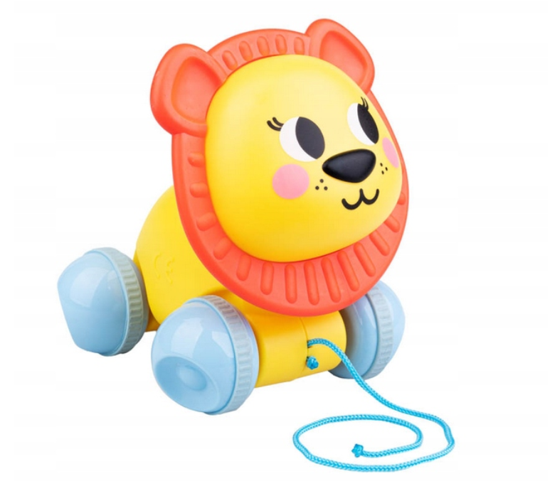 Cztery kółka, ruda grzywa, a do tego głową kiwa! Ten wesoły zwierzak zabawi najmłodszych na kilka różnych sposobów. Można go prowadzić na sznureczku, aby jechał, zabawnie kręcąc przy tym głową. Lew posiada specjalne kółeczka o nieregularnym kształcie, co zapewnia ciekawy efekt wizualny. Dodatkowo, można je rozpędzić, aby postawiony na podłodze zwierzak pojechał samodzielnie do przodu. Na boku lwa znajduje się kolorowy kwiatek, który przy przesuwaniu wydaje terkoczący odgłos.