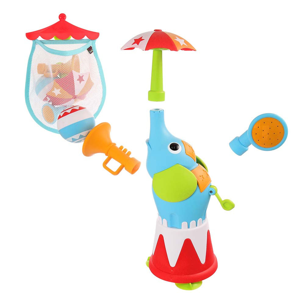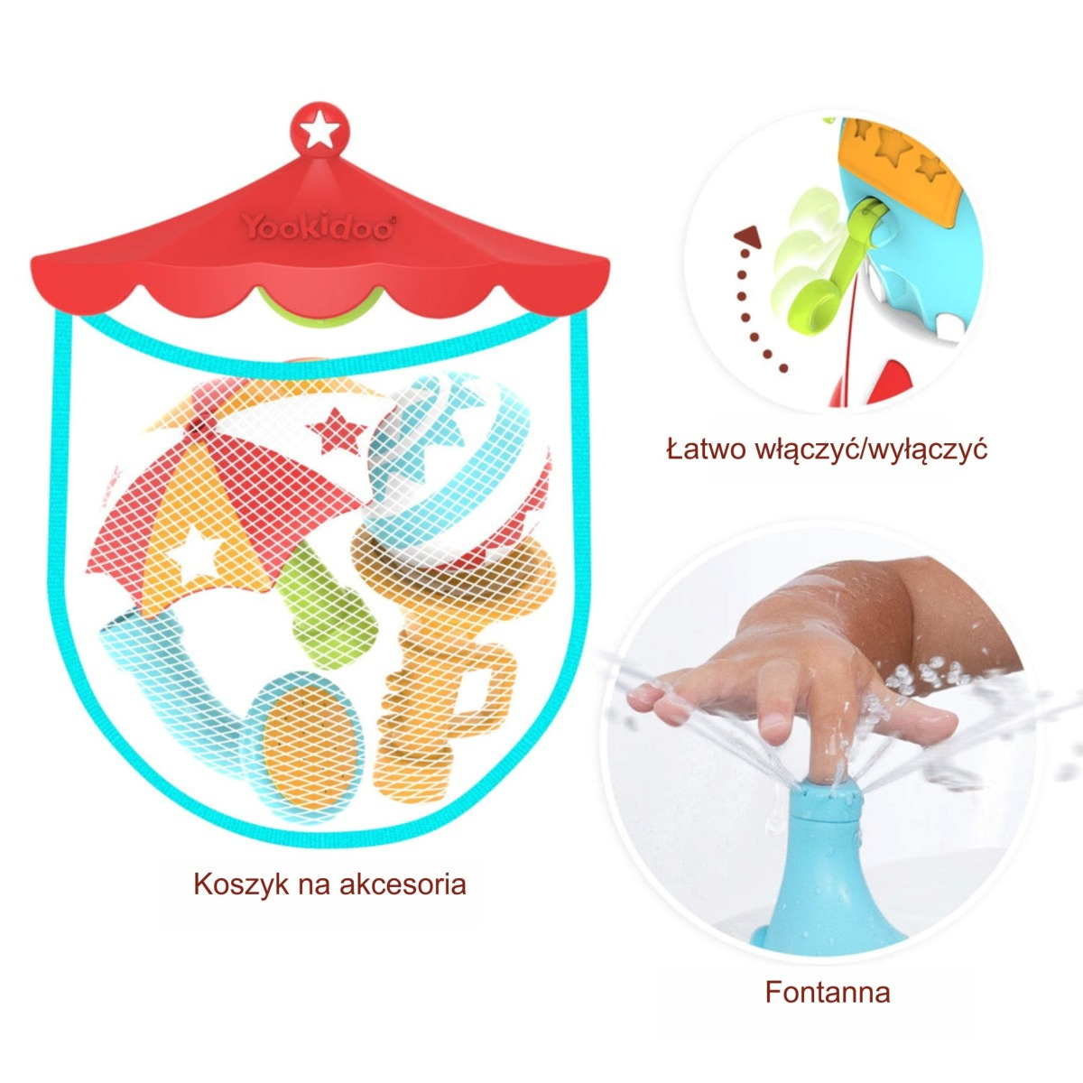 Ta zabawka do kąpieli na baterie posiada aż 4 akcesoria, które tworzą inny, zabawny efekt wodny. Słonik stojąc przyssany do wanny służy za prysznic unoszący wodę, a my możemy nakładać na jego trąbe, parasol - rozbryzgujący wodę, przedłużenie trąby w formie prysznica, czy najfajnejszy z efektów - trąbka i piłka, które w zestawie tworzą niesamowity efekt. Piłeczka obraca się położona na trąbce dzięki specjalnej konstrukcji zabawki.